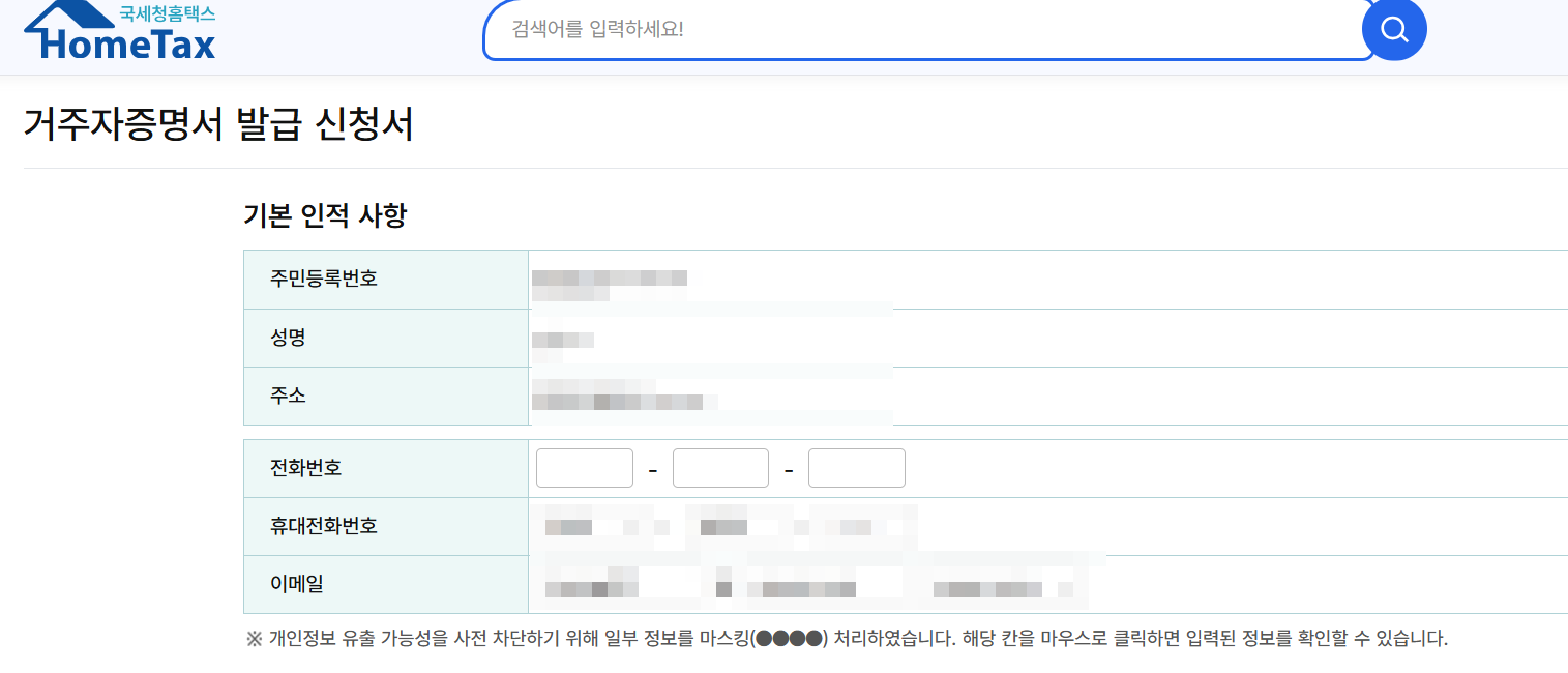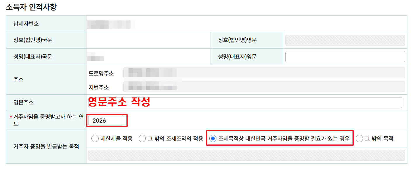 - (정석 경로: 국세증명·사업자등록·세금관련신청 > 기타 세무 증명 > 거주자증명서 발급신청)