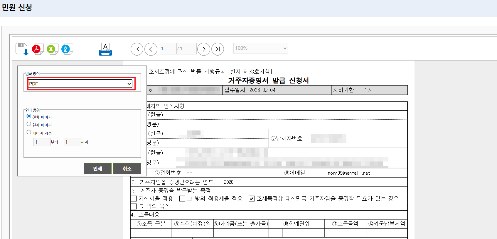 - 수령 방법: '인터넷 발급(프린터 출력)' 선택.