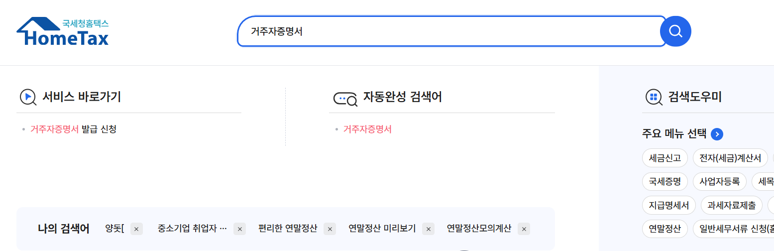 - 메뉴 찾기가 복잡하므로, 상단 검색창에 '거주자증명서'라고 입력하고 검색하세요.