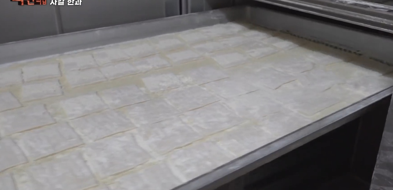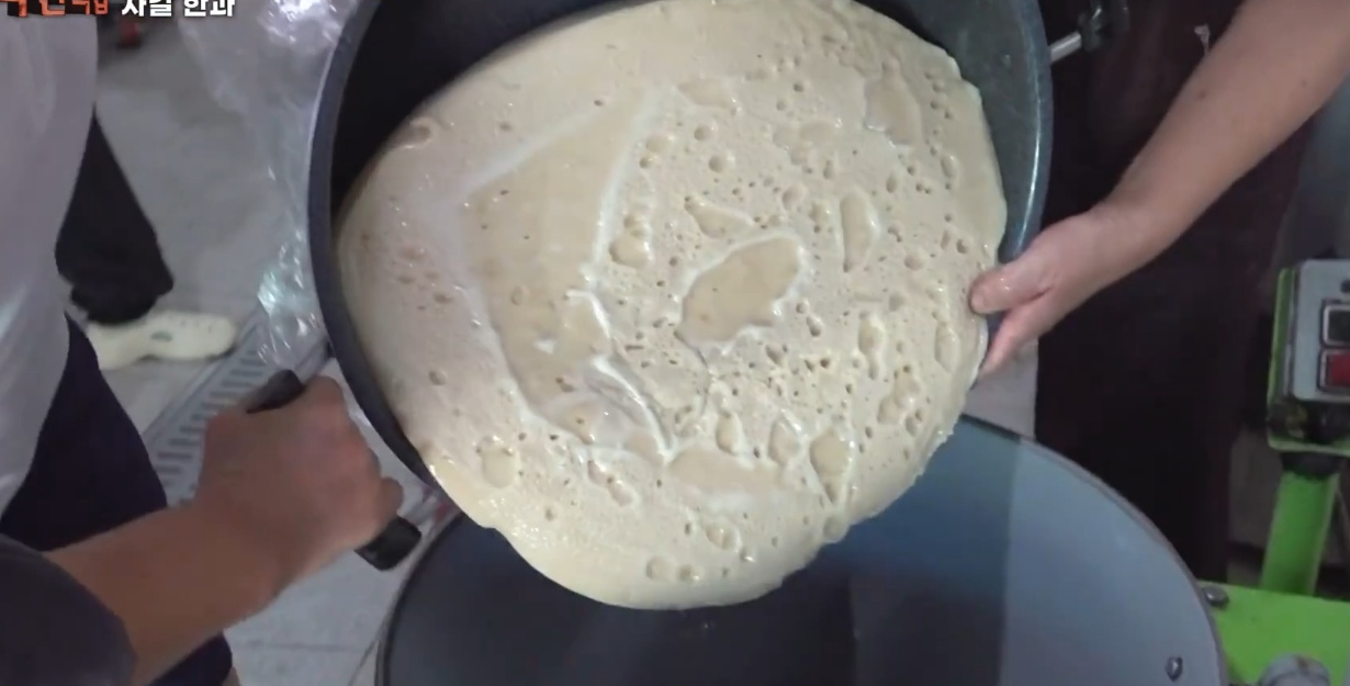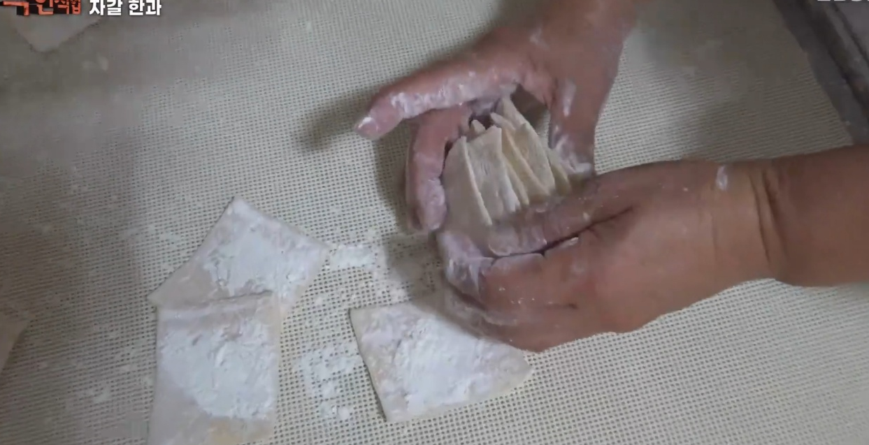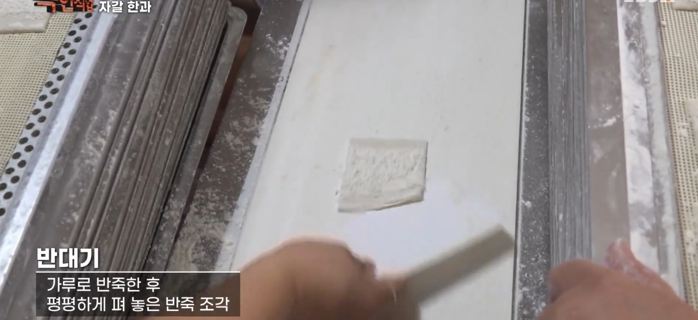 출처:EBS 극한직업 2. 찹쌀반죽을 가루로 반죽한 후 평평하게 펴 반대기를 만듭니다.