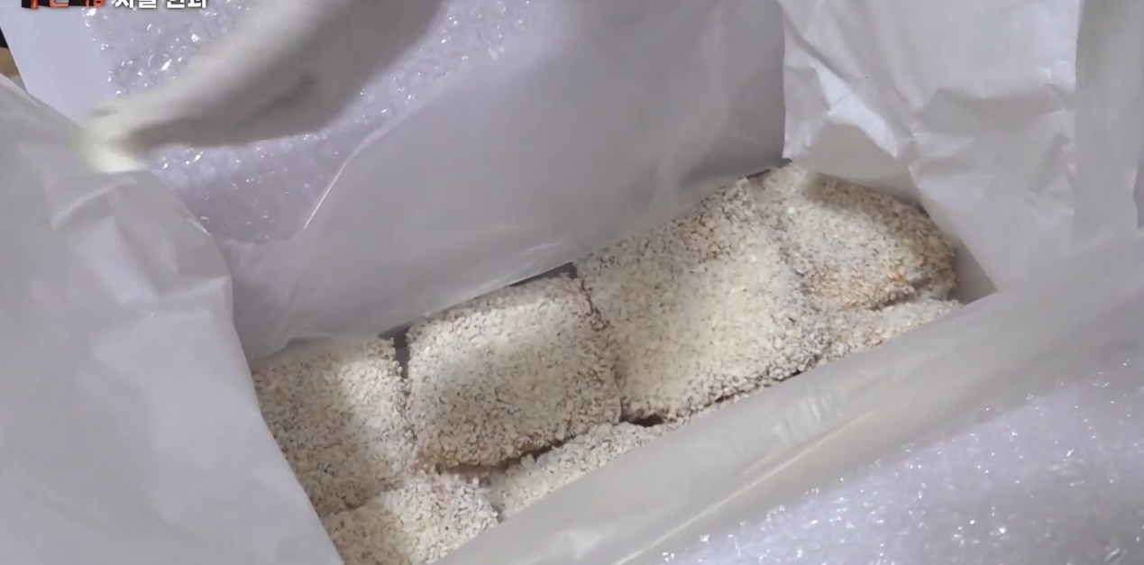 출처:EBS 극한직업 5. 잘 구운 반대기에 직접 만든 조청을 충분히 바르고 찹쌀을 묻혀 한과를 만듭니다.