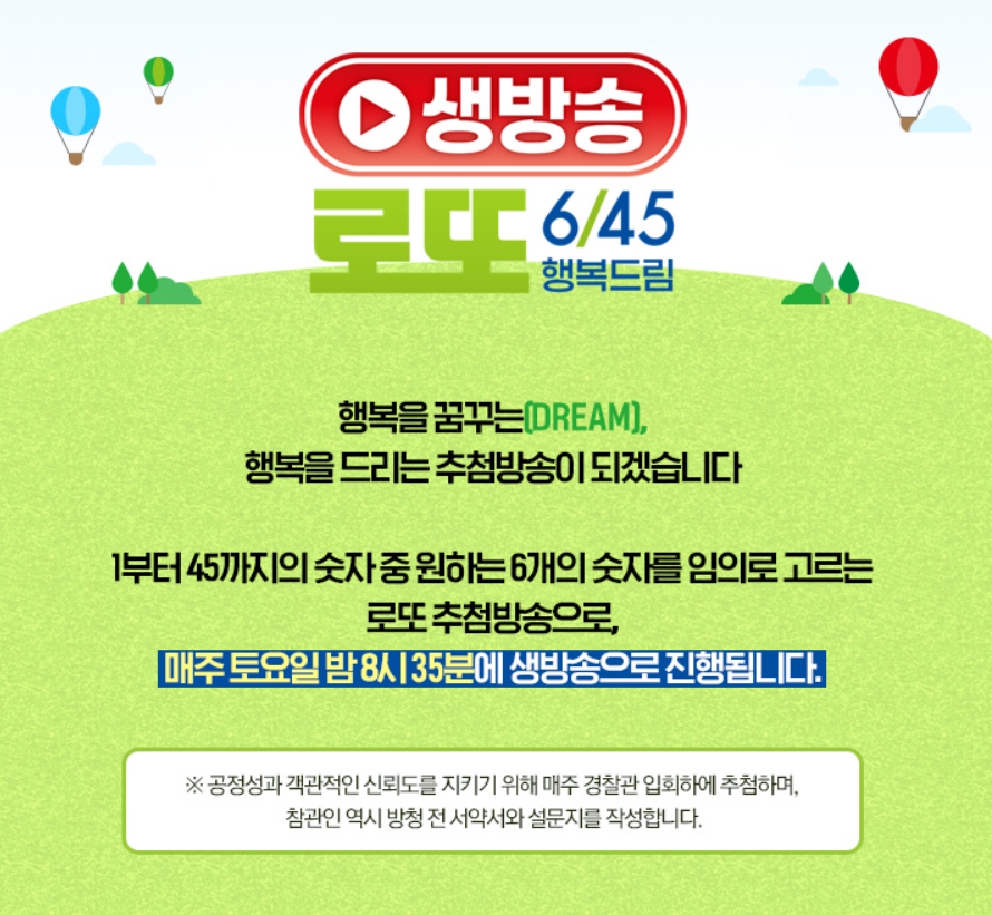 현재 로또 6/45 추첨은 생방송으로 진행됩니다. 과거에는 녹화로 방송된 적도 있었지만, 공정성에 대한 논란이 커지면서 현재는 생방송 체제로 운영되고 있습니다. 동행복권과 방송사 MBC에 따르면, 매주 토요일 오후 8시 35분경 MBC 스튜디오에서 실시간으로 추첨이 이루어지며, 이 과정은 방청객과 감독관이 함께 지켜봅니다.