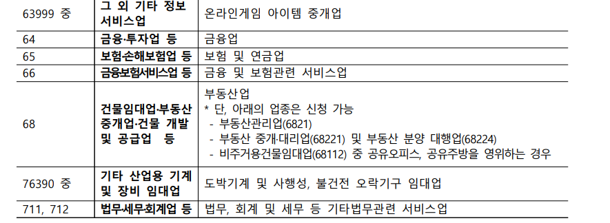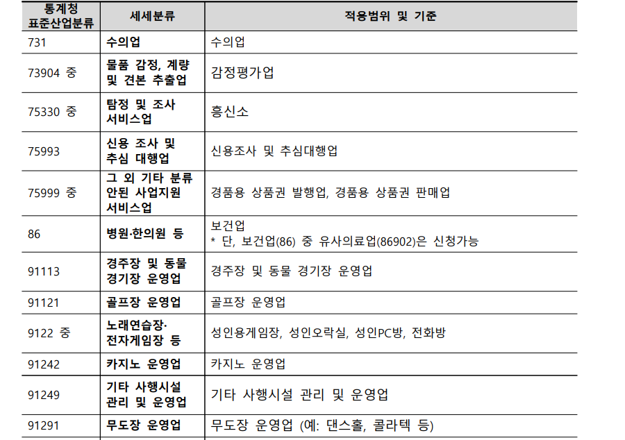 중소벤처기업부는 소상공인 정책자금 제외 업종을 기준으로 부담경감 크레딧 지원에서 제외합니다. 2025년 기준 주요 제외 업종은 다음과 같습니다.