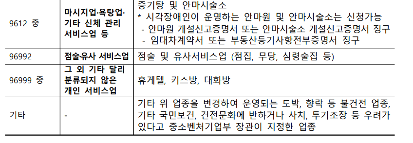 - 무도장, 무도학원, 골프연습장 등 일부 레저 업종