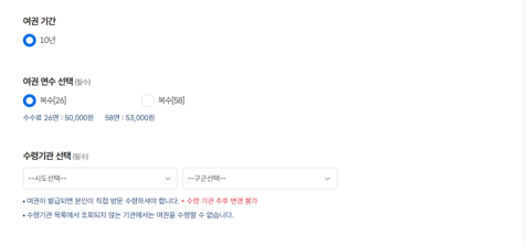 • 여권종류, 여권기간, 여권면수, 수령기관 선택 (※ 수령기관은 추후 변경 불가)