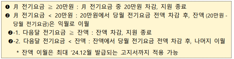 - 월 전기요금이 20만 원 이상이면 바로 차감 후 종료되고, 20만 원 미만이면 잔액은 익월로 이월됩니다.