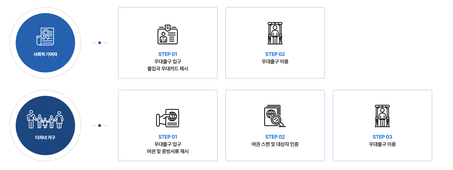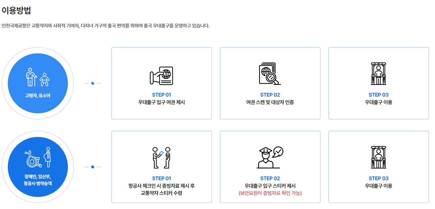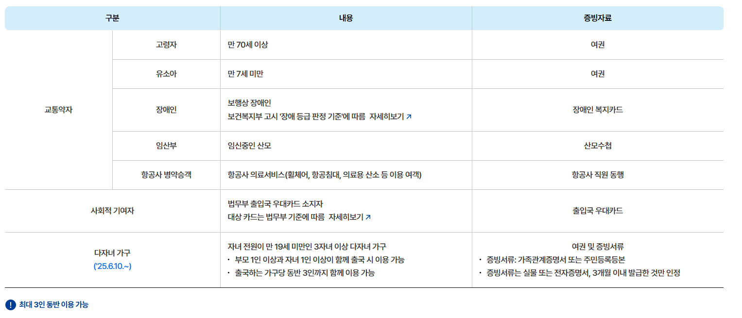 - 기타: 항공사 병약승객, 출입국 우대카드 소지자(모범납세자 등)