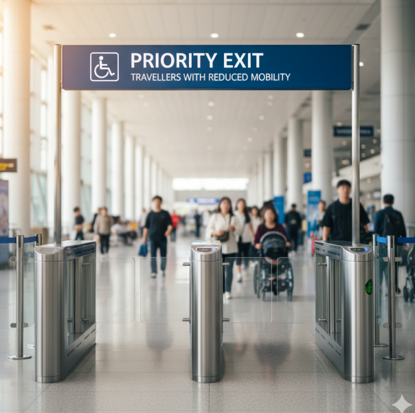 스티커가 부착된 여권을 가지고 **'교통약자 우대출구(Priority Lane)'**로 이동하여 보안요원에게 보여주고 입장합니다.
