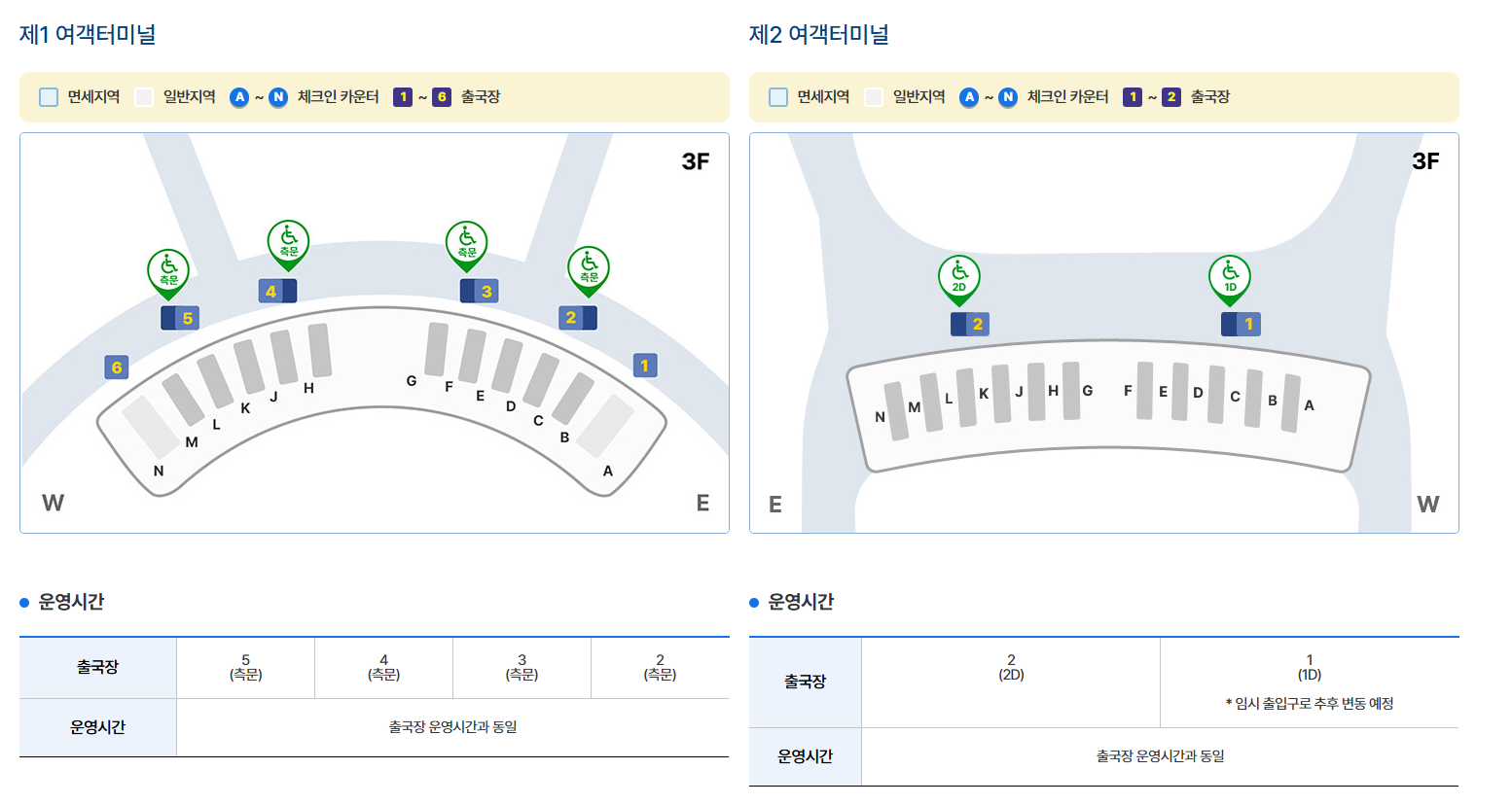 📌 꿀팁: 제1터미널의 경우 전용 출국장(1, 6번)이 닫혀 있어도, 일반 출국장(2~5번) 측면에 있는 '교통약자 우대 통로'를 이용하면 되니 당황하지 마세요.