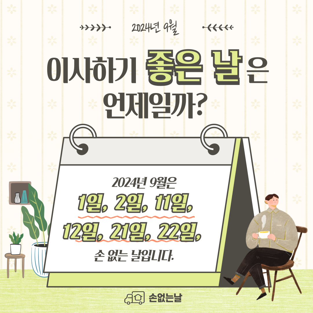 2024년 9월에는 6번의 9월 이사 손없는 날이 있습니다. 이 날들은 이사와 결혼식 날짜로 인기가 많아, 미리 일정을 계획하는 것이 중요합니다.