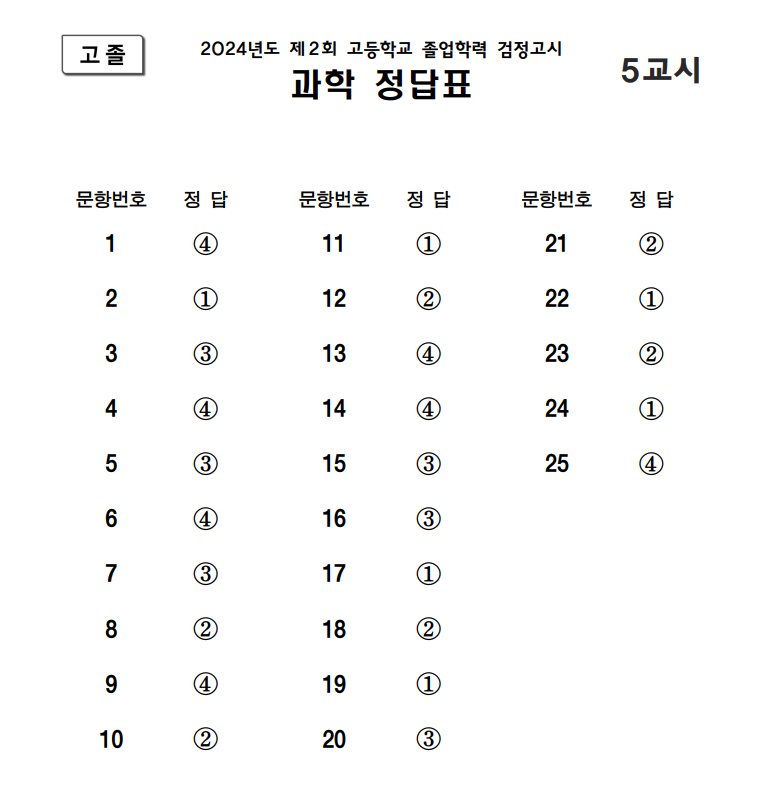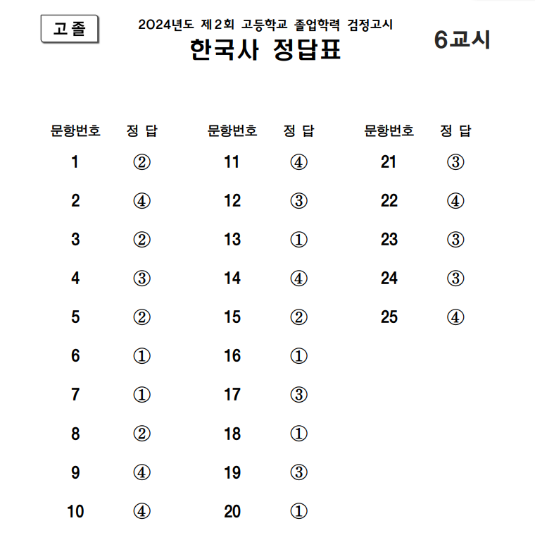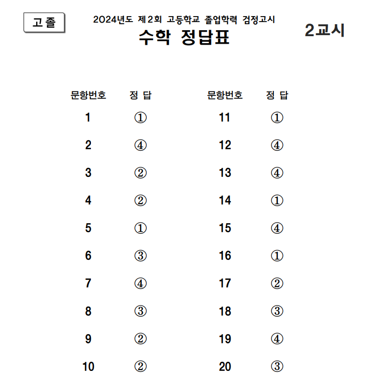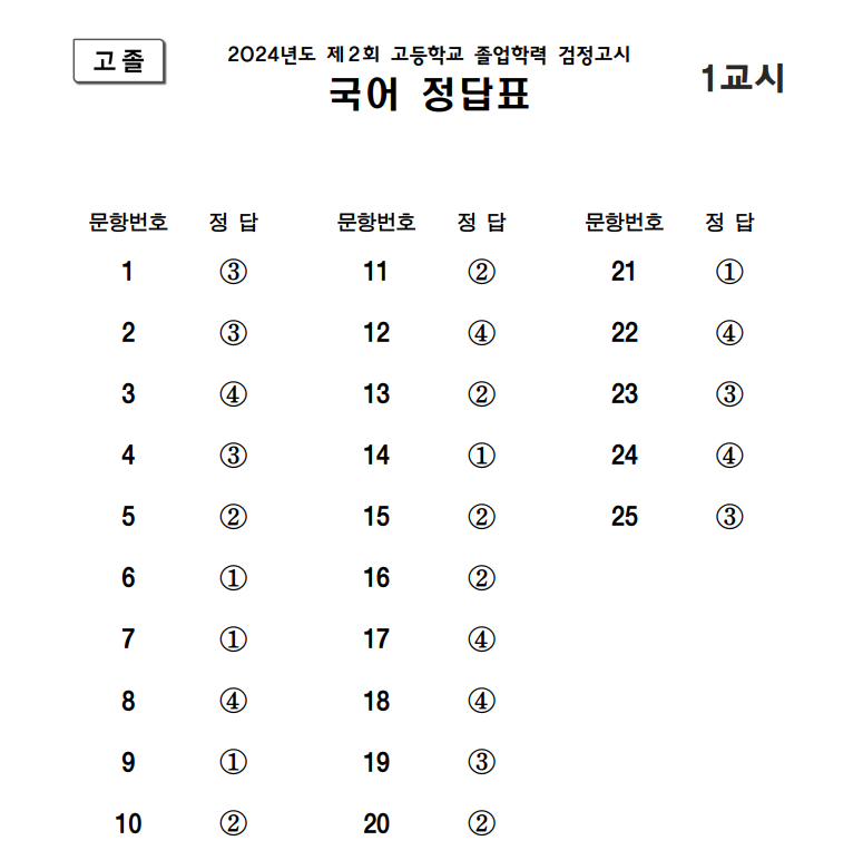 1. 2024년 제2회 고등학교 졸업학력 검정고시 답지