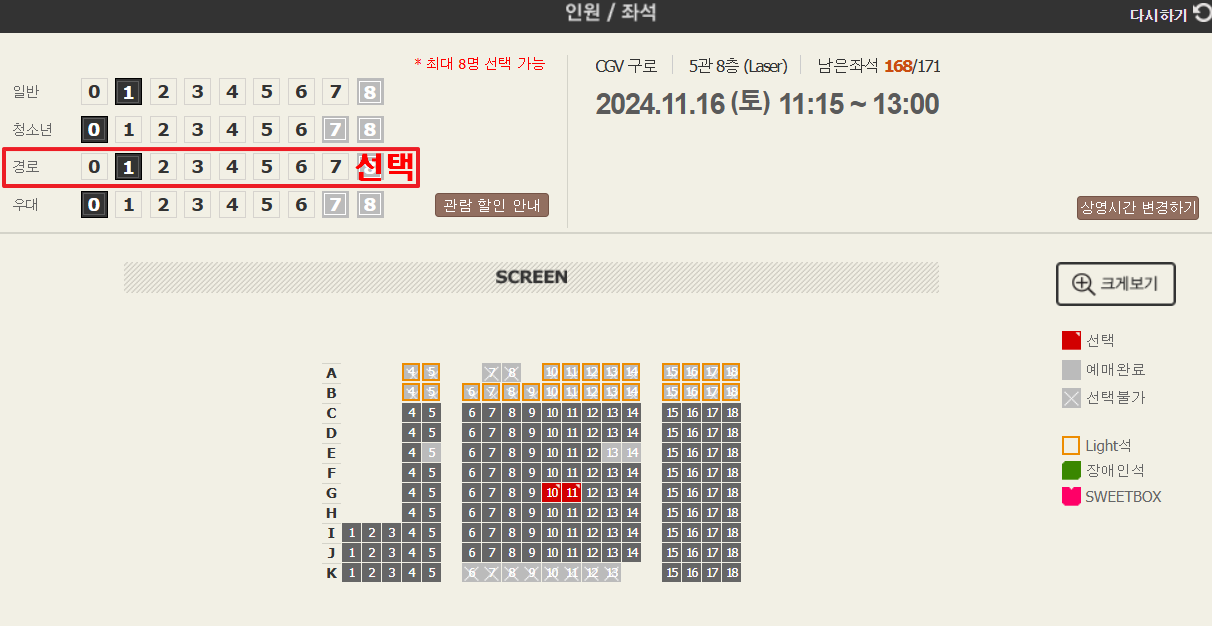 🍿 좌석 위치: 시력이 좋지 않거나 청각이 약하신 분들을 위해 앞쪽 좌석을 선택하시면 더욱 편리합니다.