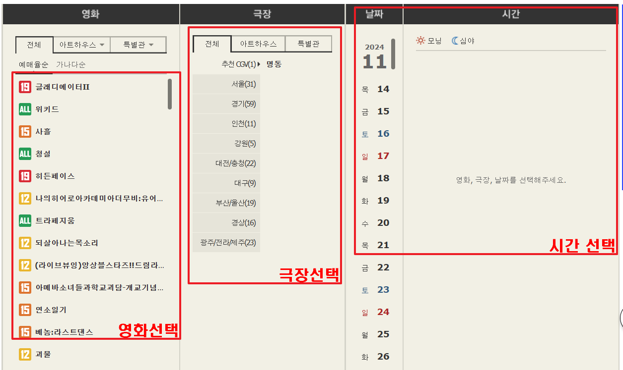 원하는 영화와 상영 시간, 좌석을 선택합니다.