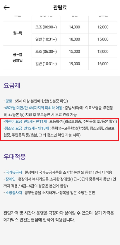 아이들과 함께 영화 보시기 전에 청소년 나이와 어린이 요금 등 관람료 우대적용 여부 확인하시는 데 도움이 되셨으면 좋겠습니다. 가족들과 즐겁게 영화 보시면서 행복한 하루 보내세요.